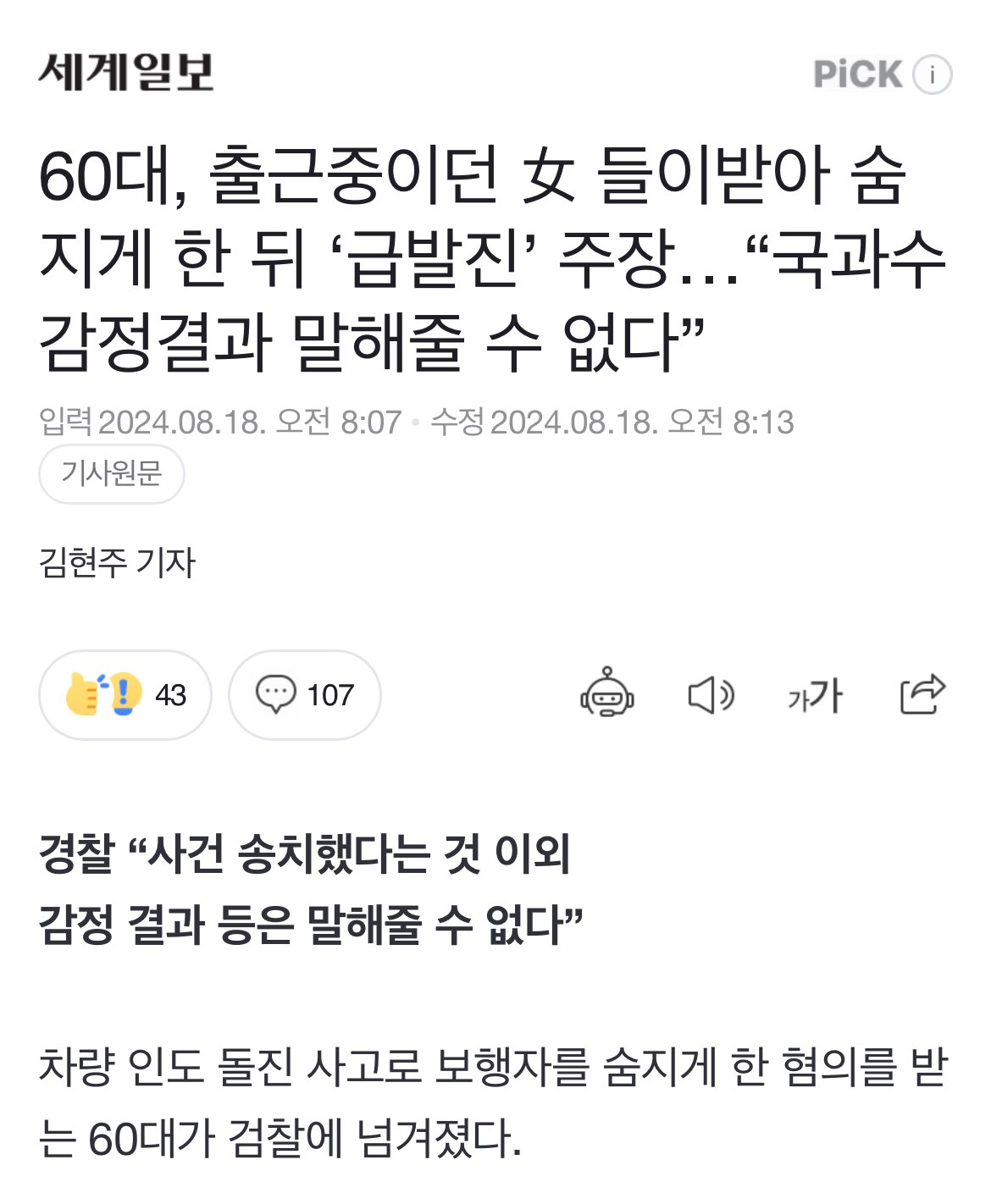 60대, 출근중이던 女 들이받아 숨지게 한 뒤 ‘급발진’ 주장