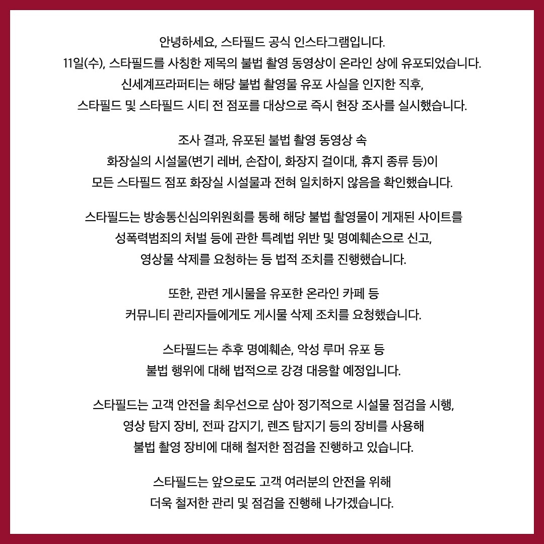스타필드 공식 인스타그램 업데이트 (불법촬영 동영상 관련)