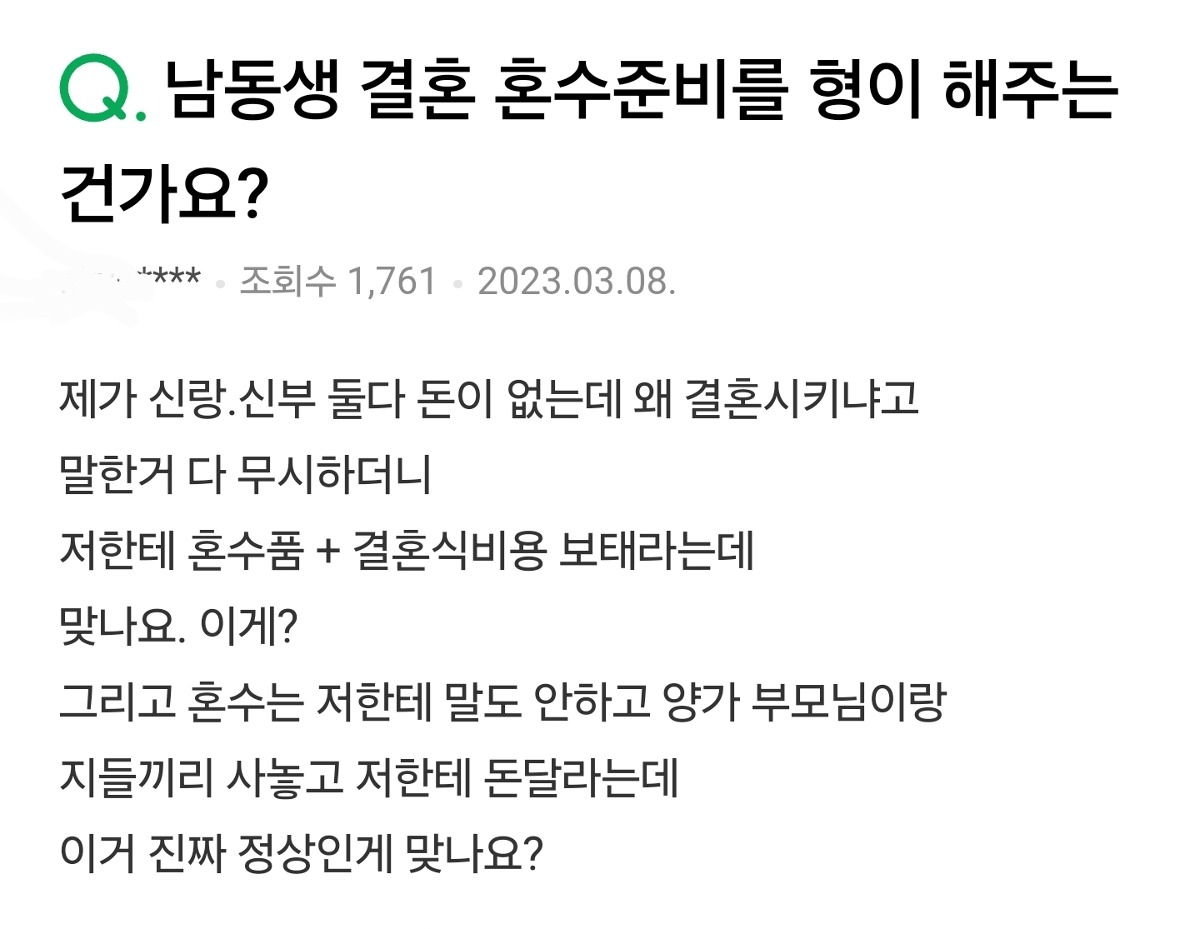 형한테 결혼식 비용 달라는 동생