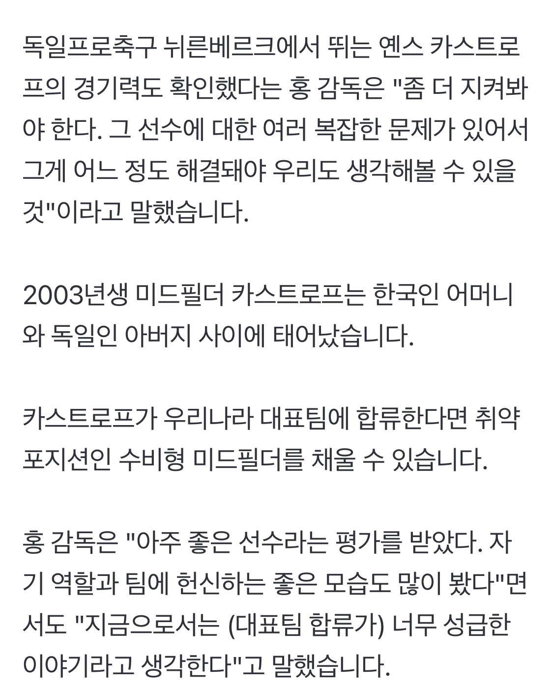 홍명보 감독 “옌스 카스트로프 대표팀 합류는 성급한 이야기”