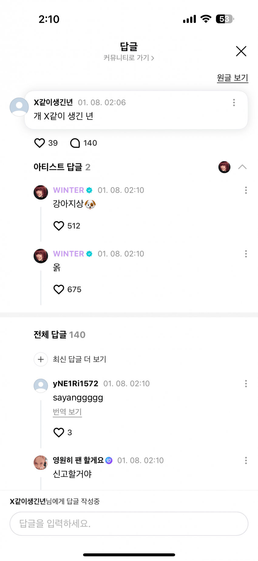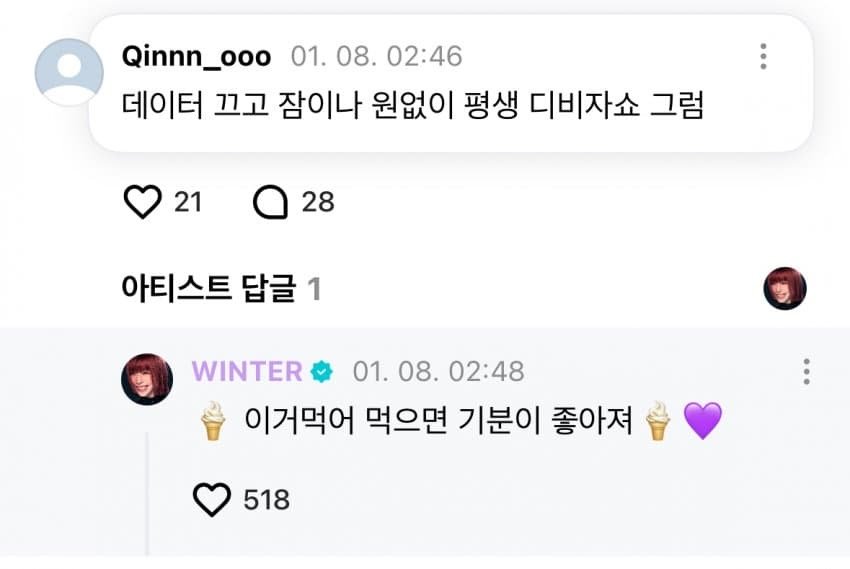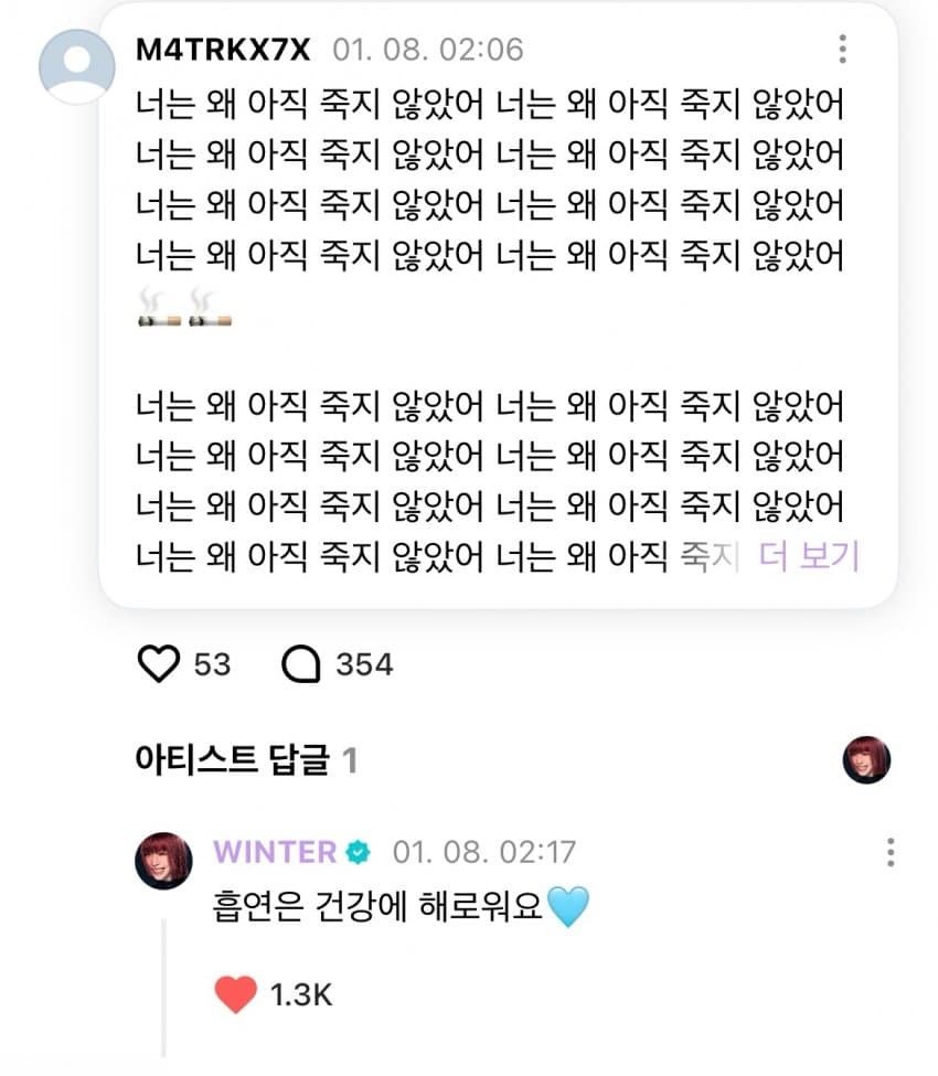 본인 악플에 직접 답글 남기는 에스파 윈터