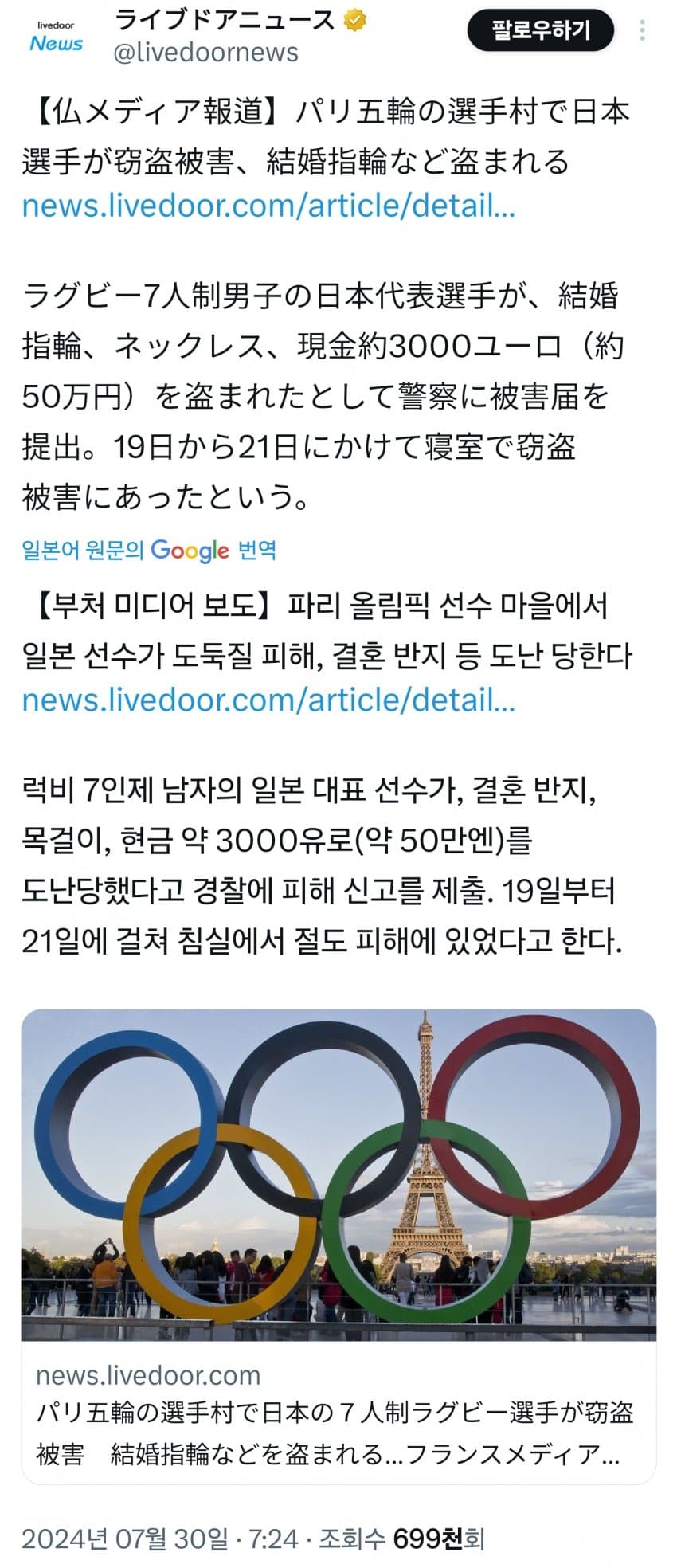 올림픽 출전 일본선수 선수촌에서 결혼반지 털림