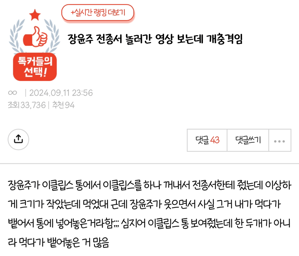 언니가 먹는건 왜 내꺼보다 크냐 물어보니까 장윤주가 푸흐흐흐흡 웃으면서 너가먹은거 내가 먹던거라고 했다는거임;