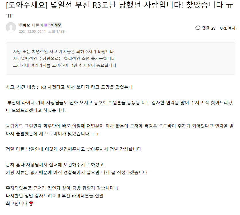 바이크만 찾았고 서류 훔쳐간 사람은 아직 못찾은듯