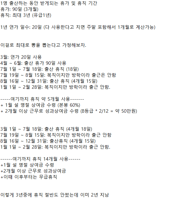 그렇다쳐도 아이 한명당 4년은 우습게 휴직할 수 있음.
