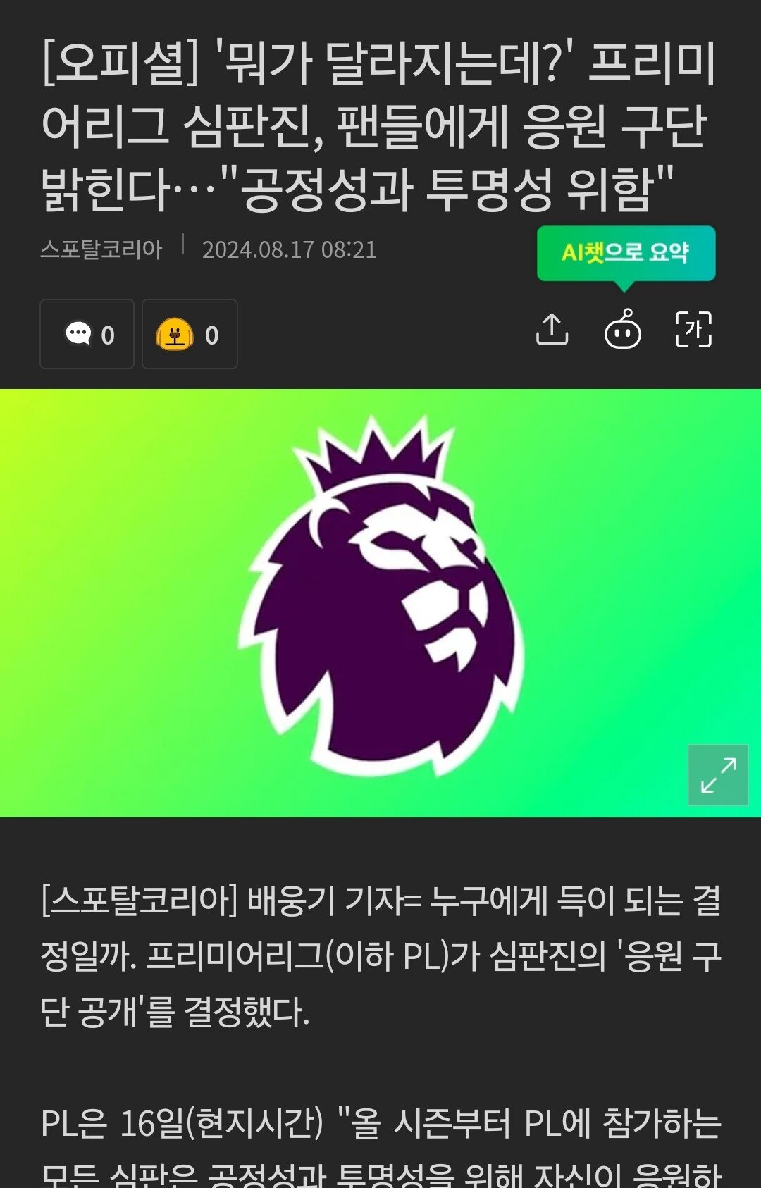 프리미어리그 심판진, 팬들에게 응원 구단 밝힌다.