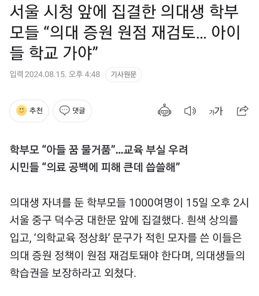 의대증원 철회하라고 의대생 학부모 1000명 시위 ㄷㄷ