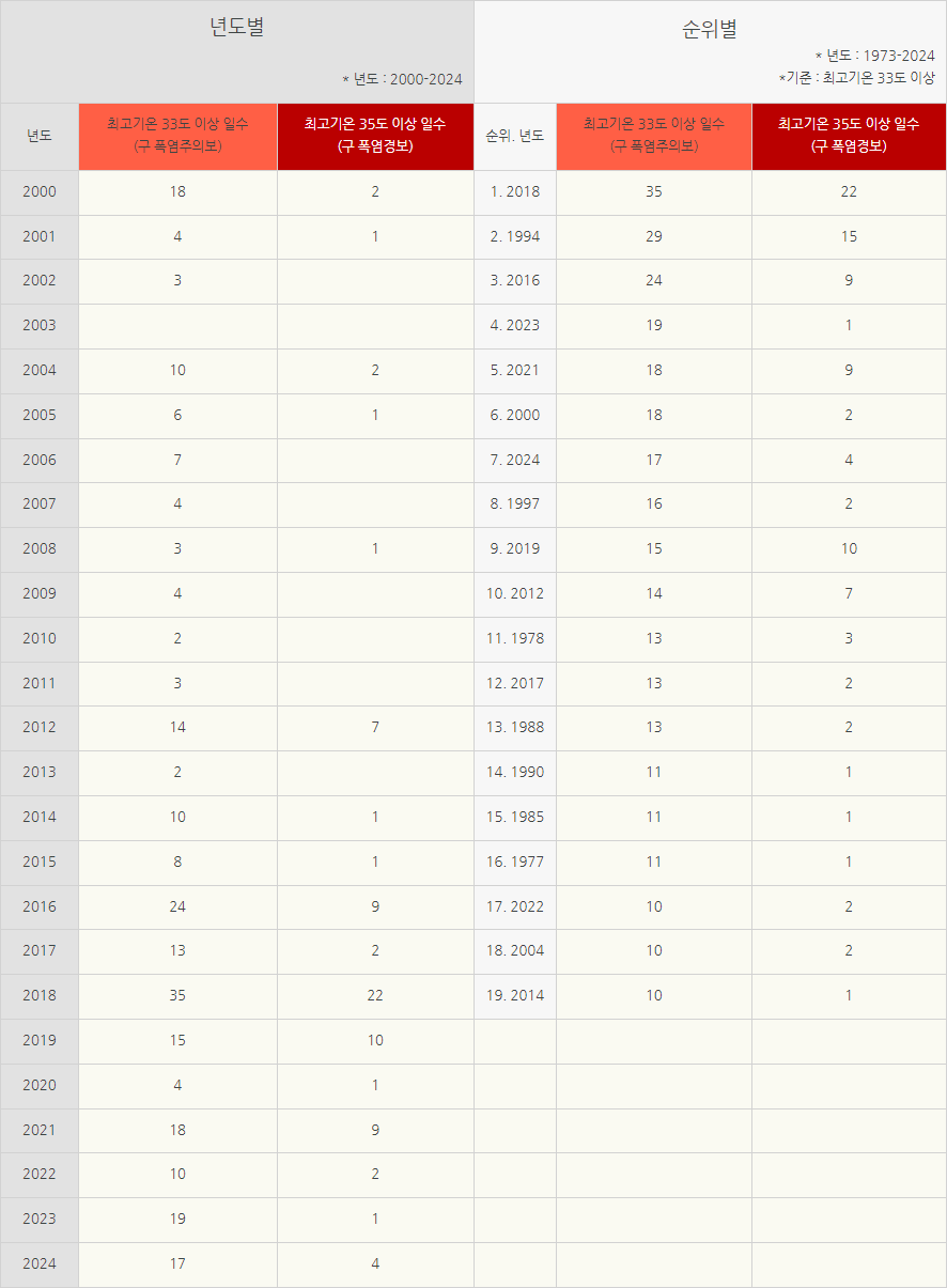 위 표를 보면 폭염 순위 1위는 2018년, 2위는 1994년이며 이후 2016년, 2023년, 2021년 순임.