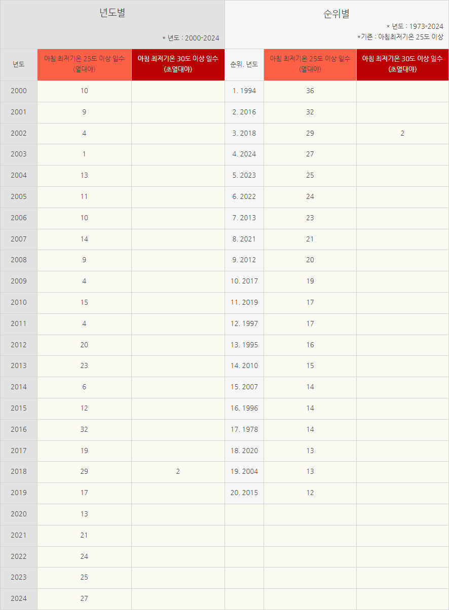 열대야 일수는 폭염보다 순위가 높은데, 이번 주와 다음 주까지 열대야가 이어질 것이라는 기상청 예보를 참고해보면 올해 서울의 열대야 일수는 역대 1위를 기록할 가능성도 있음. 다만 다음 주 날씨는 바뀔 가능성이 높아지고 있어 1위 기록은 좀 더 지켜봐야.