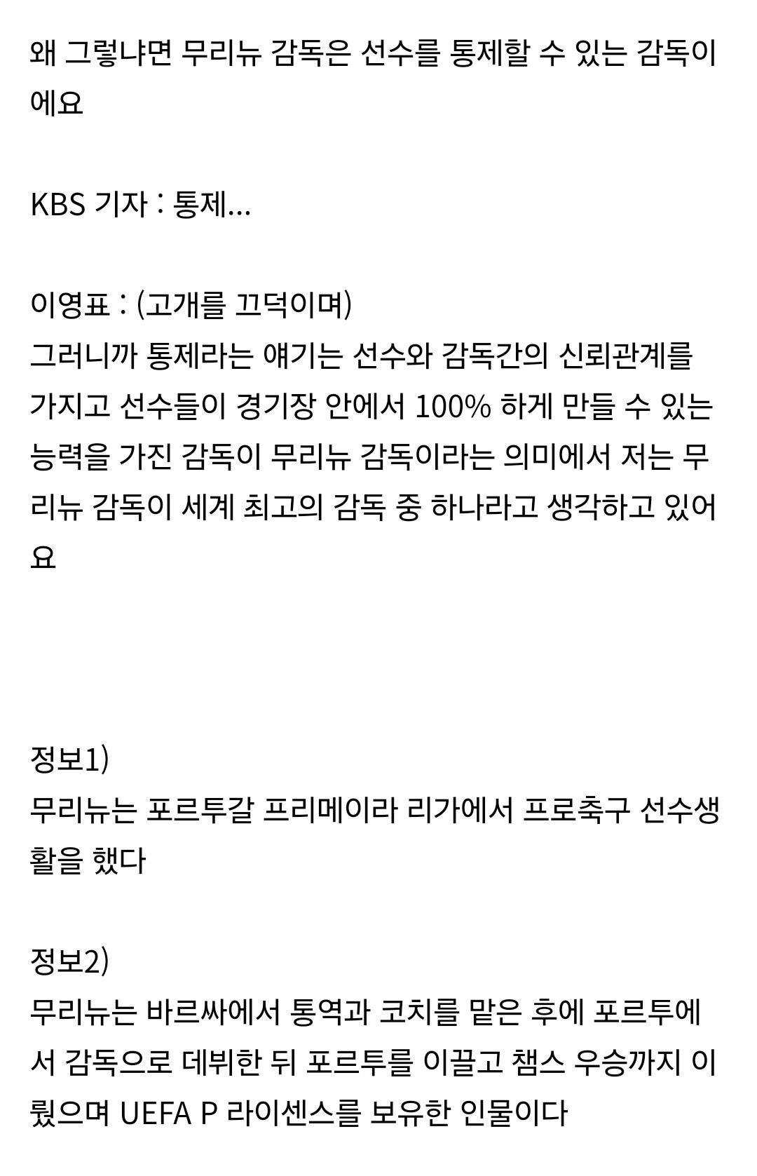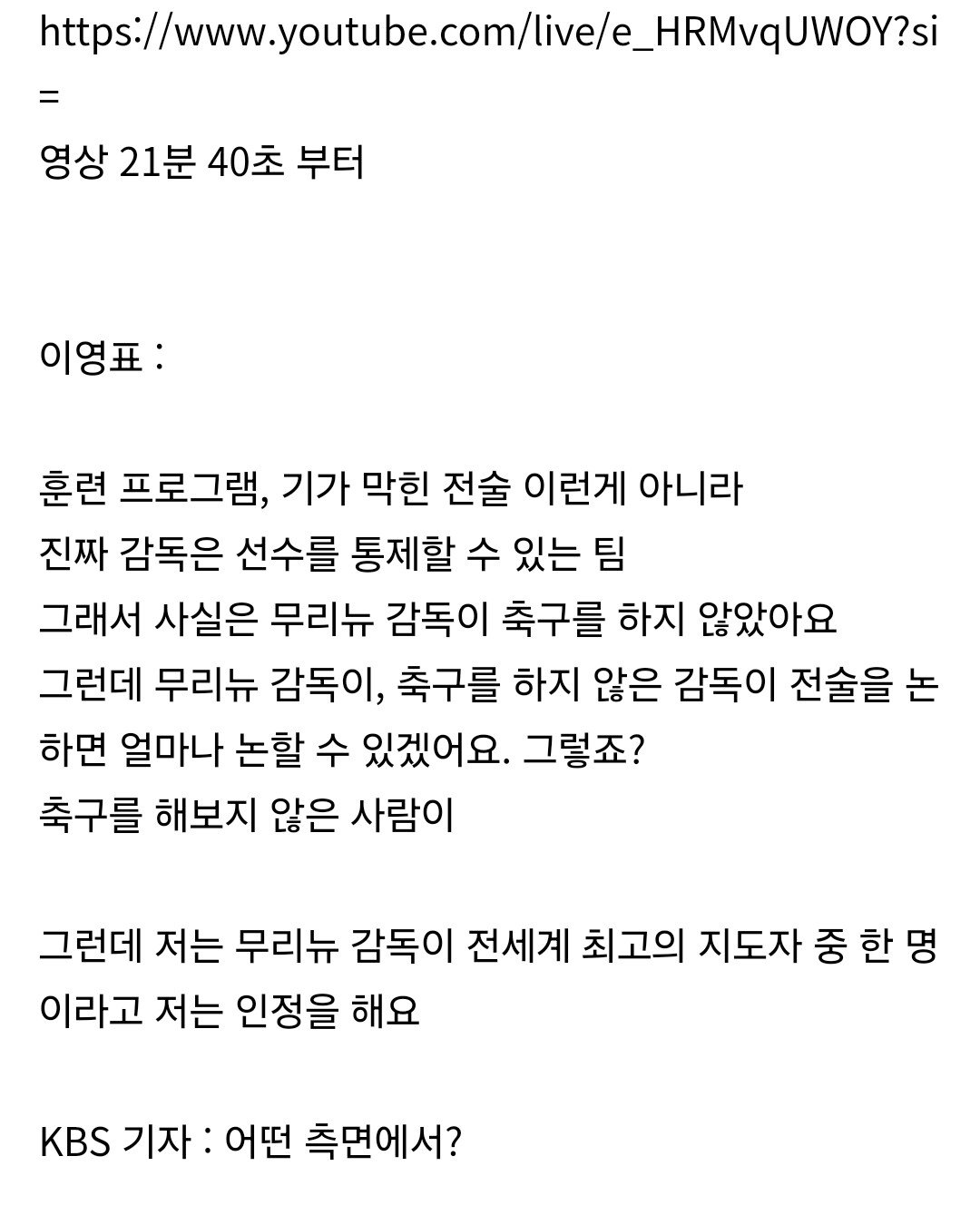 이영표 "무리뉴 감독은 축구를 안해봤기 때문에 전술을 얼마나 논하겠나"