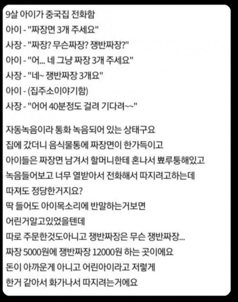 짜장면 주문하는 9살 아이에게 쟁반짜장 배달한 중국집 사장