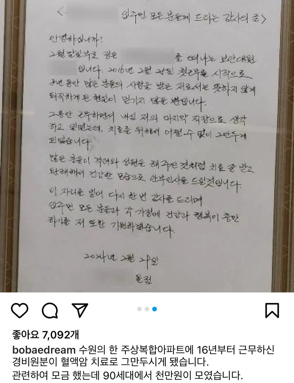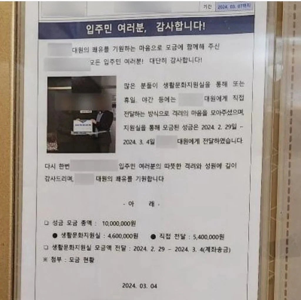 8년간 근무한 경비원이 암 치료로 그만두게 되자 주민들이 치료비로 천만원 모금