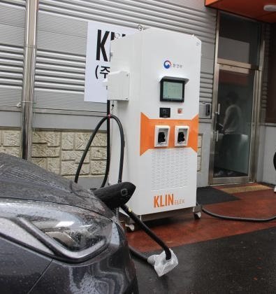 전기차 급속 충전기 중에 양팔형이 있음 사람처럼 기계 몸체 하나에 전기차 두개를 급속으로 충전 할수 있는 충전기임
