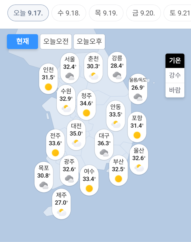 9월 중순이 지났는데도 전국 온도가 31~34도 심지어 대구는 36도를 넘김 ㄷㄷㄷ