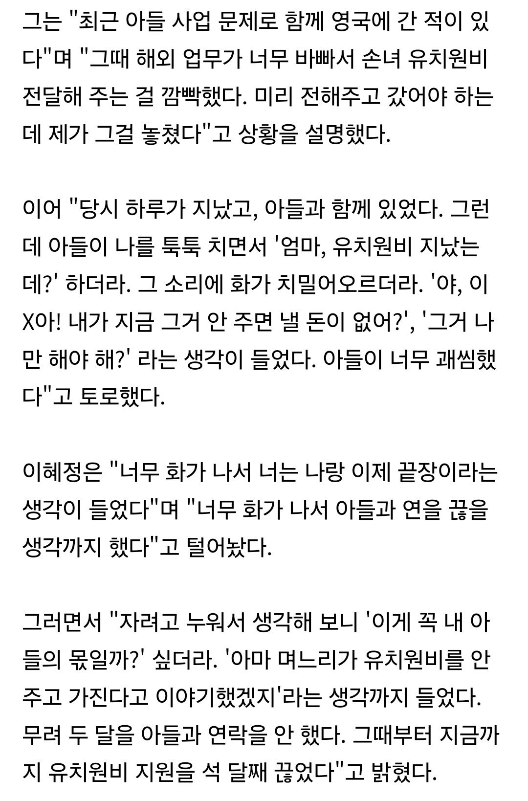 이혜정 "손녀 유치원비 좀 늦자 독촉, 아들 괘씸…연락 끊고 산다"