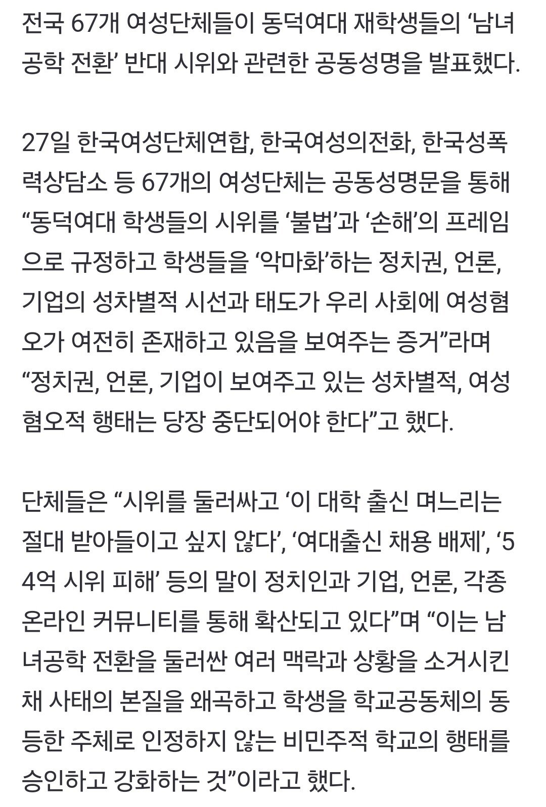 동덕여대 학생 지지한 67개 여성단체 성명 좆선일보에도 입갤 ㄷㄷㄷㄷㄷㄷㄷㄷ