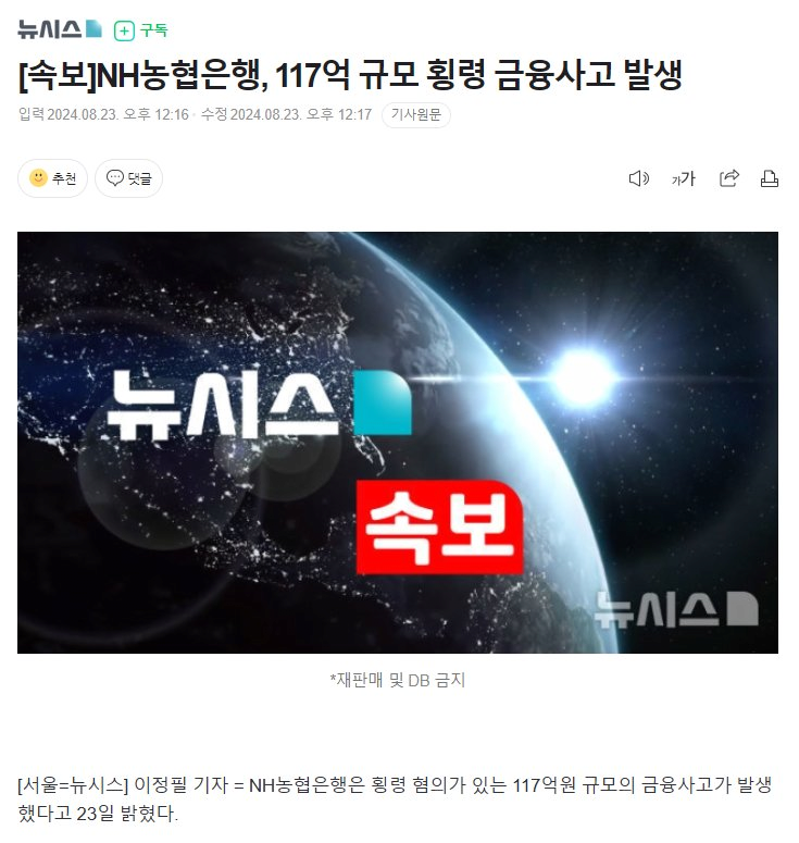 NH농협은행, 117억 규모 횡령 금융사고 발생