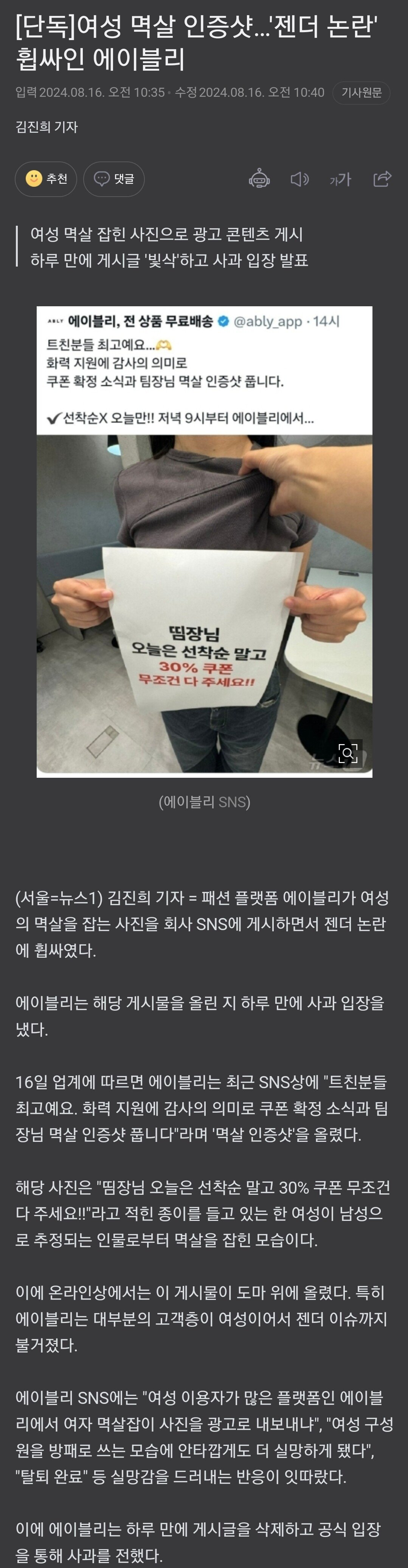 [단독]여성 멱살 인증샷…'젠더 논란' 휩싸인 에이블리