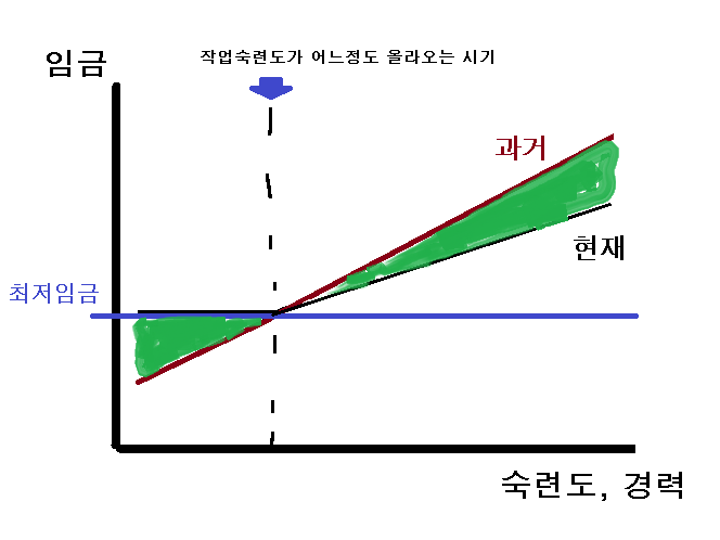 최저시급이 급하게 오르다보니 신입 때 임금만 오르고 이후 연봉인상폭은 오히려 줄어듬.