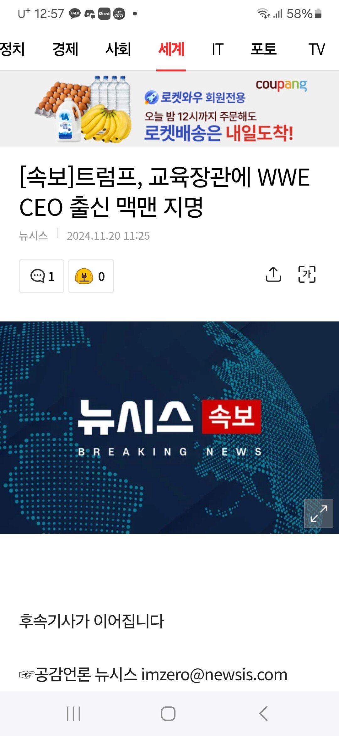 [속보]트럼프, 교육장관에 WWE CEO 출신 맥맨 지명
