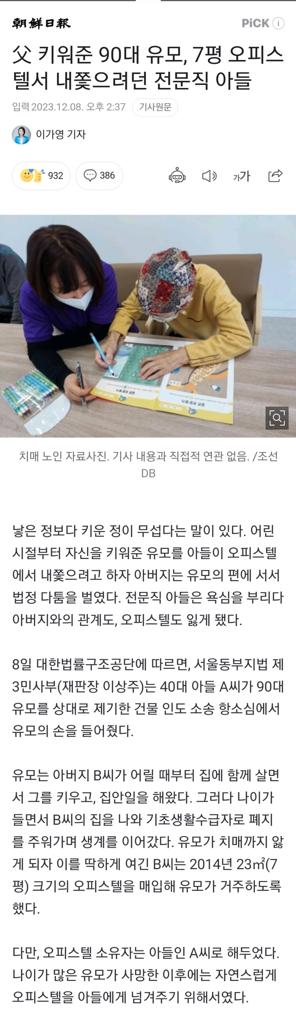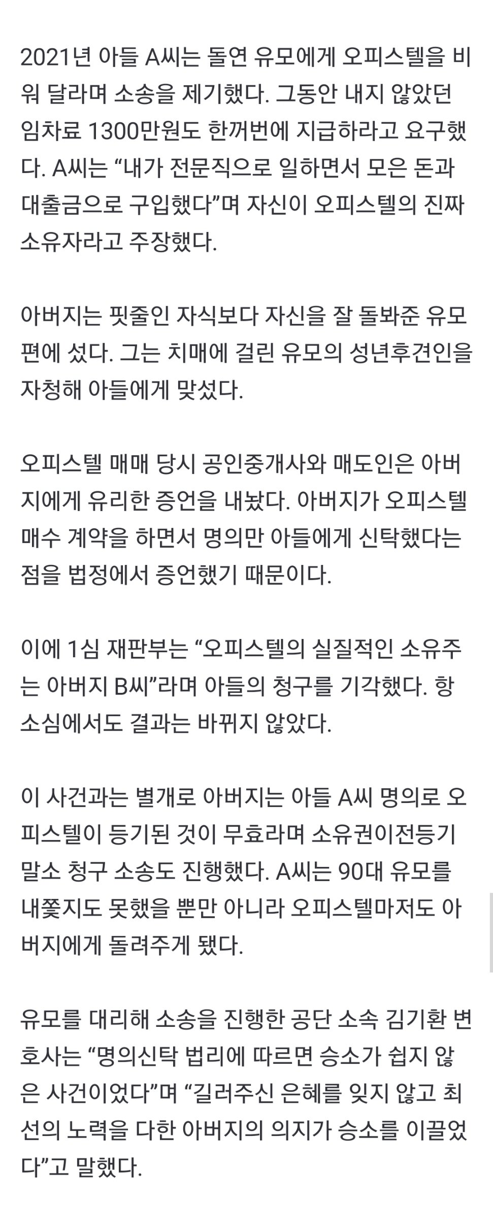 정 씨의 아들은 정 씨가 유모 박모 씨(95)를 위해 9년 전 매입해준 서울 성동구 오피스텔에서 나가 달라며 박 씨를 상대로 건물인도 소송을 냈다. 자신의 명의로 된 오피스텔을 처분하겠다는 것이었다. 하지만 항소심 재판을 맡았던 서울동부지법은 지난달 28일 박 씨의 손을 들어줬다.