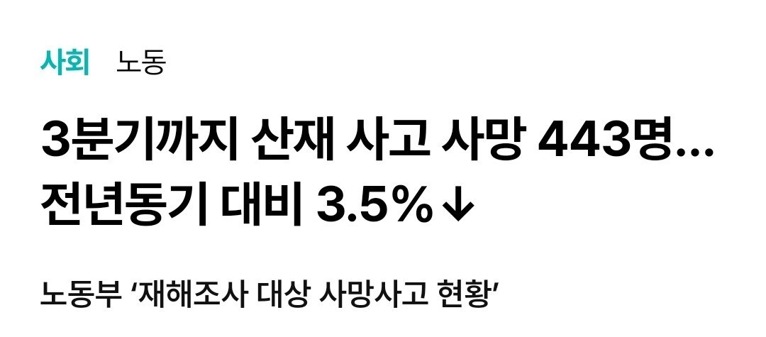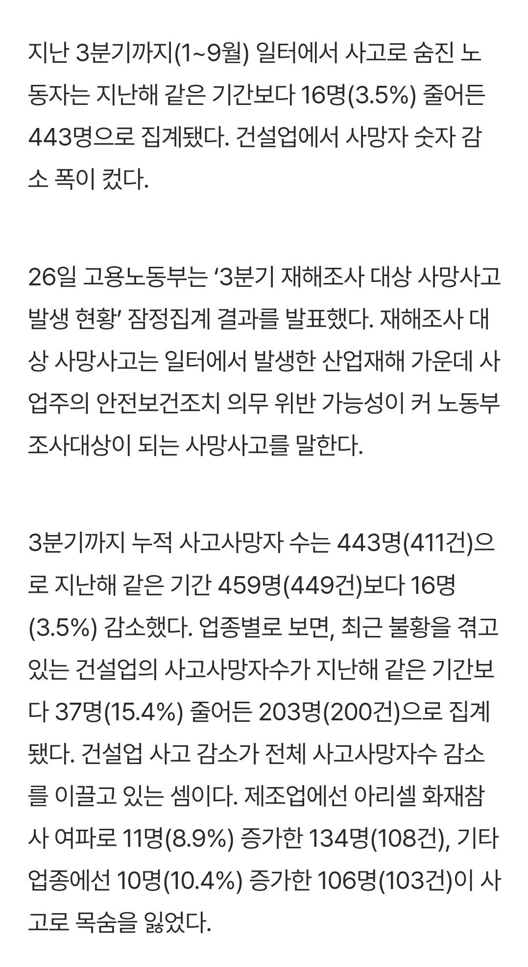 3분기까지 산재 사고 사망 443명…전년동기 대비 3.5% 감소