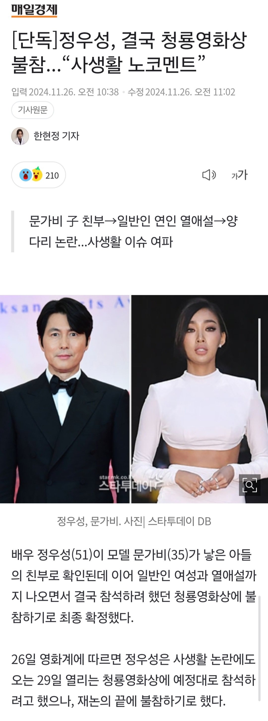 [단독]정우성, 결국 청룡영화상 불참...“사생활 노코멘트”