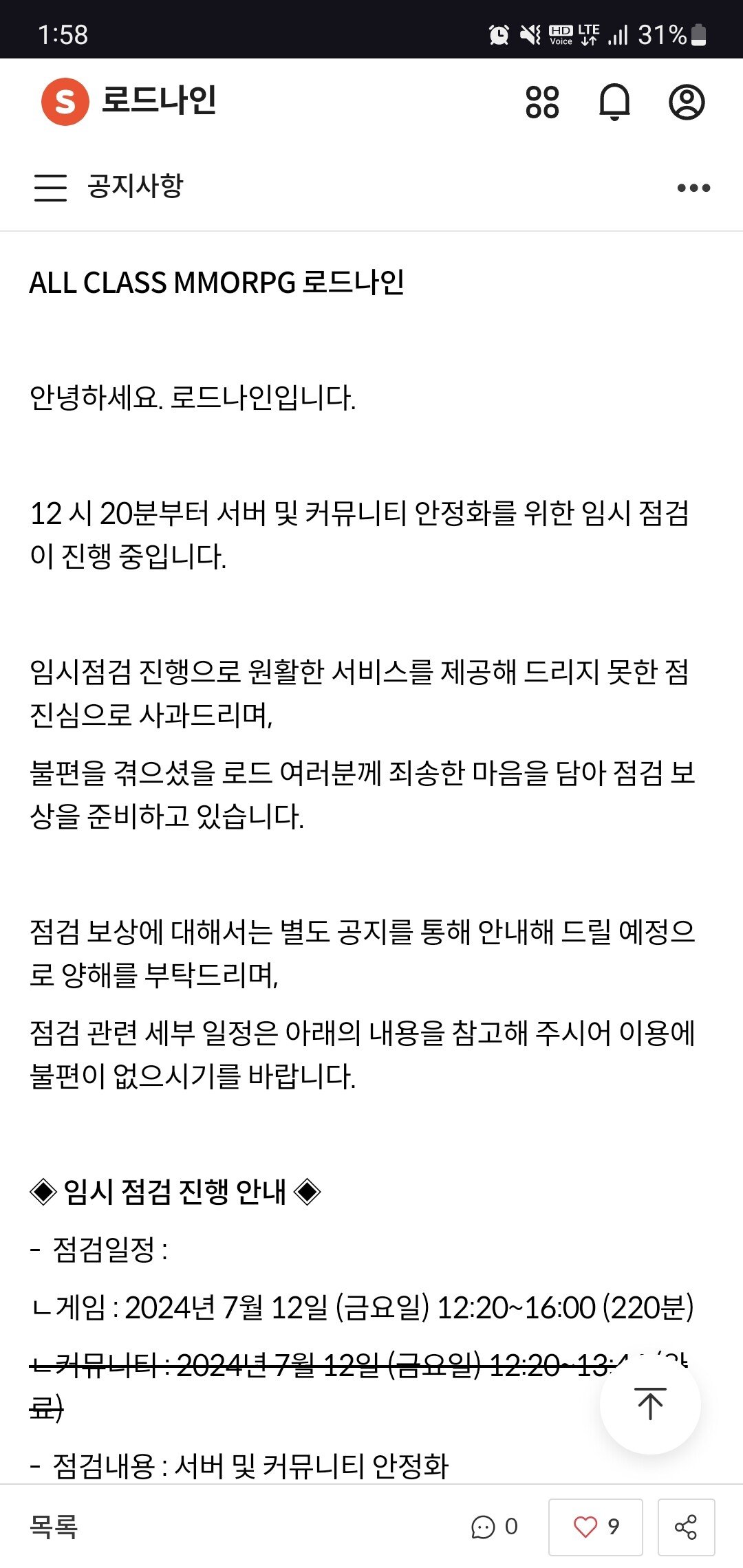 오픈 20분만에 1대명검 임시점검 4시간 짜리 뽑음