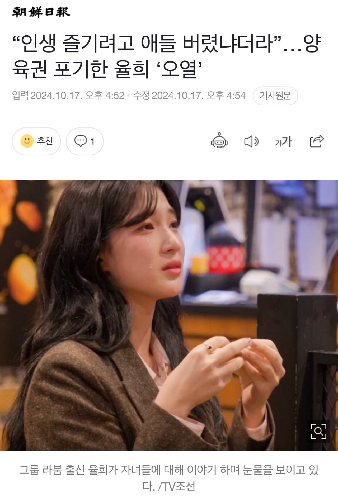 율희는 아이들을 사랑하지 않아서 양육권을 포기한 것이 아니라며 “집 나오기 전까지 울면서 아이들 사진을 다 찍었다”고 함..(???)