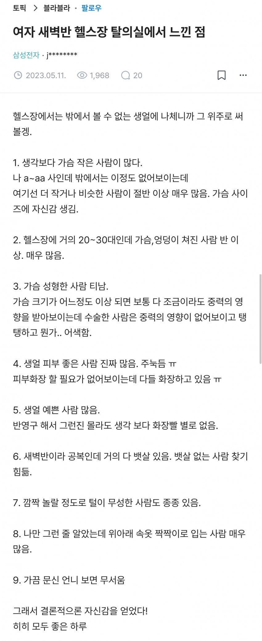여자 새벽반 헬스장 탈의실에서 느낀 점