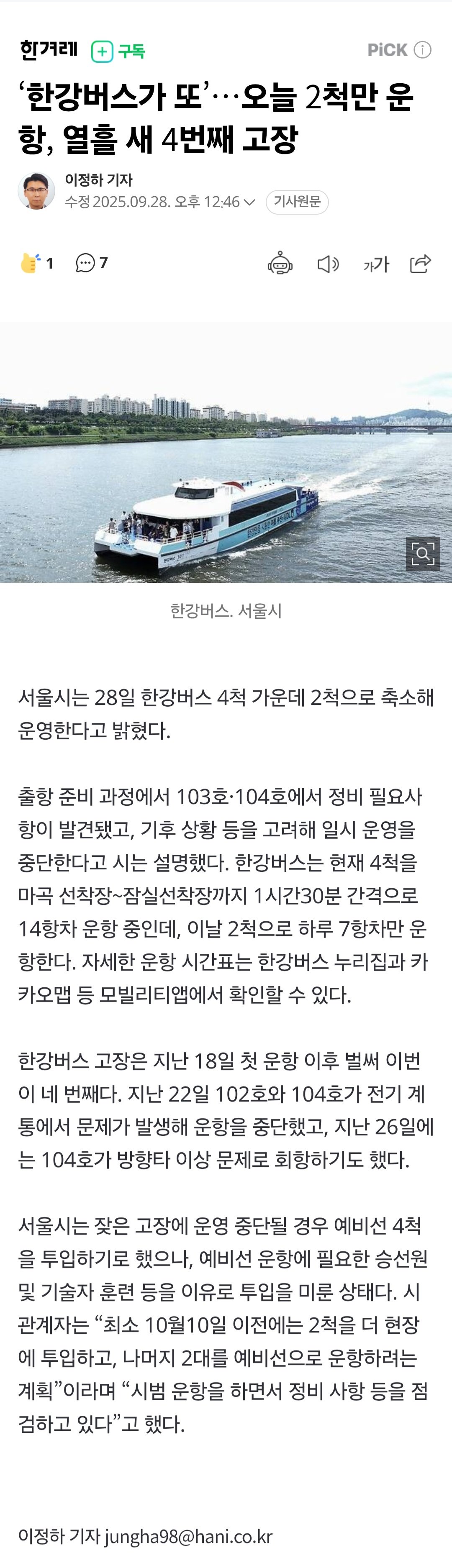 ‘한강버스가 또’…오늘 2척만 운항, 열흘 새 4번째 고장